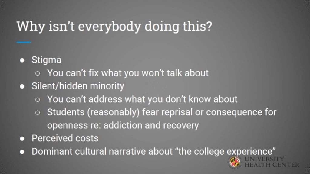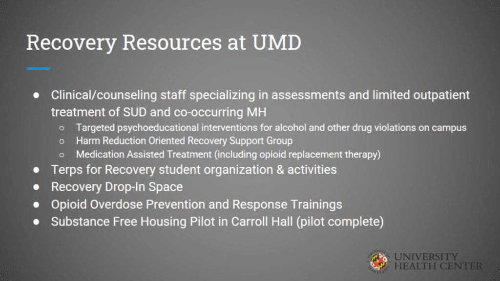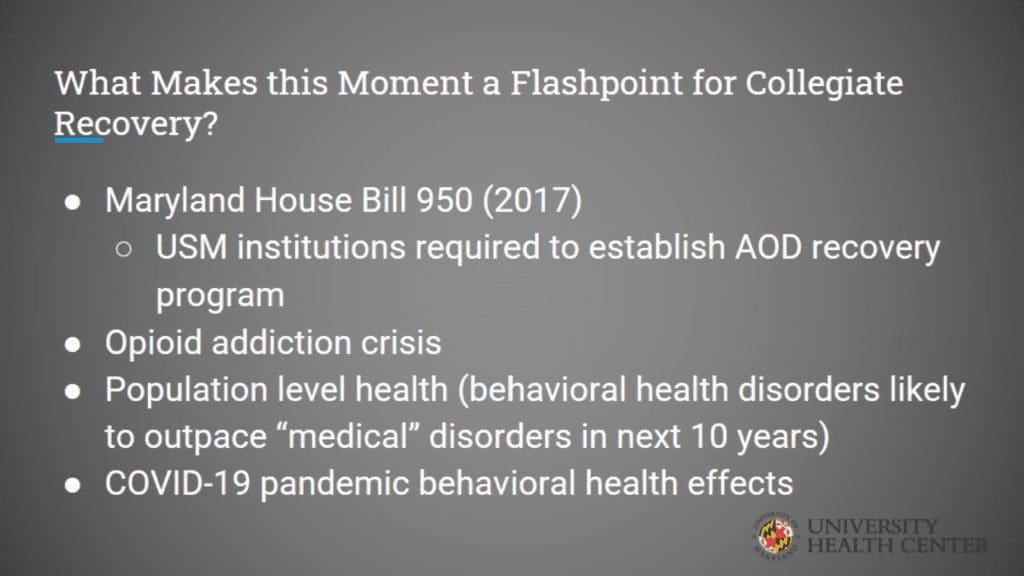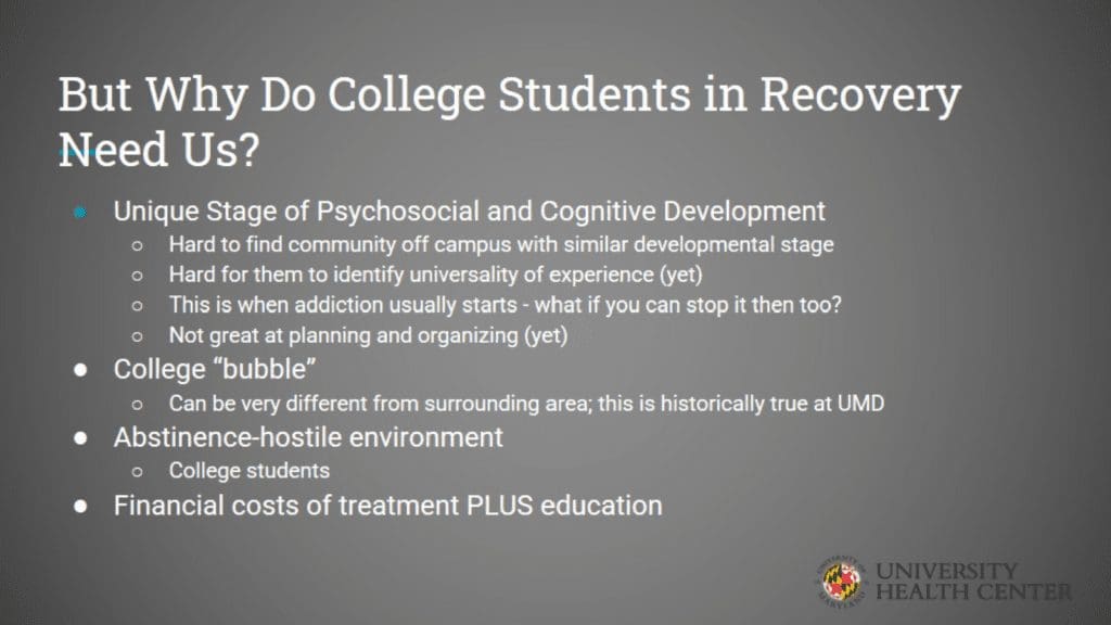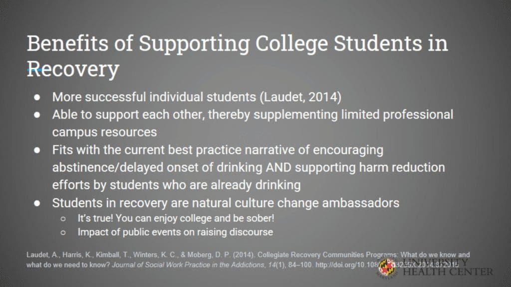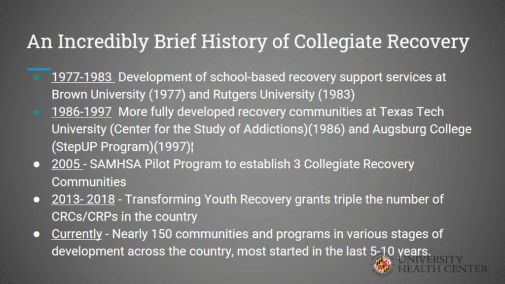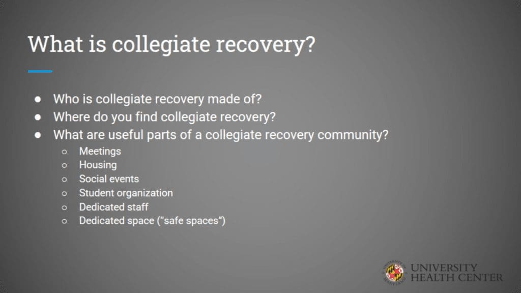 To support students in recovery, make it a priority to start a collegiate recovery program and overcome challenges. This presentation from the University of Maryland University Health Center outlines the history and importance of collegiate recovery programs.